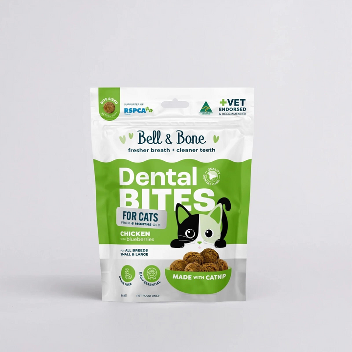 Keep your feline friend's teeth sparkling clean with Bell & Bone Dental Bites! These tasty treats combine chicken and blueberries with a dash of catnip to create an irresistible dental experience your cat won't be able to resist. Purrfect for maintaining oral health while treating your furry companion to something they'll go wild for!