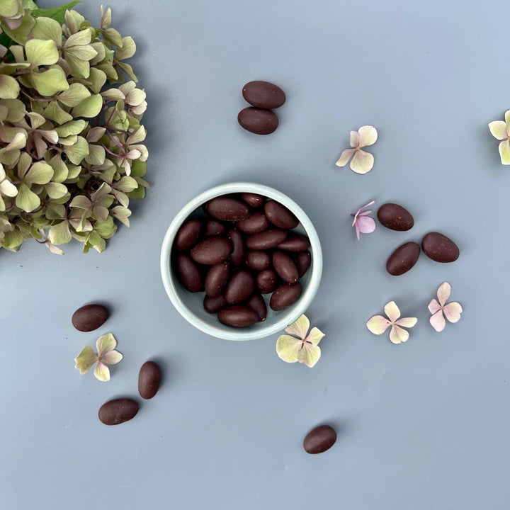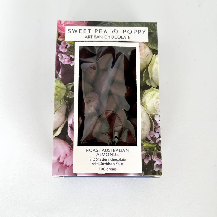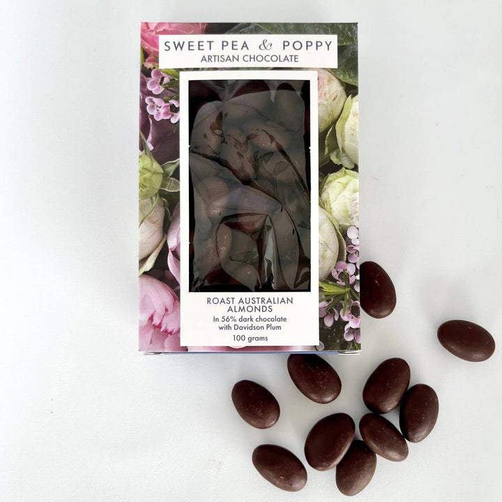 Roast Australian almonds coated in 56% dark chocolate with native Davidson Plum Our single origin dark chocolate from Ecuador provides the perfect pairing to locally roasted almonds, making a thoughtful gift or indulgence. All natural ingredients, vegan friendly. No palm oil, no shellac coating, nothing artificial. 100 grams