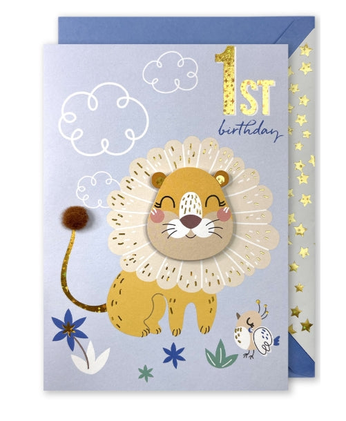 Celebrate a little one's first milestone with this playful “1st” Lion card set against a vibrant blue background. Featuring charming embellishments, it adds a fun and joyful touch to your special message, perfect for marking a memorable birthday with a roar of happiness.