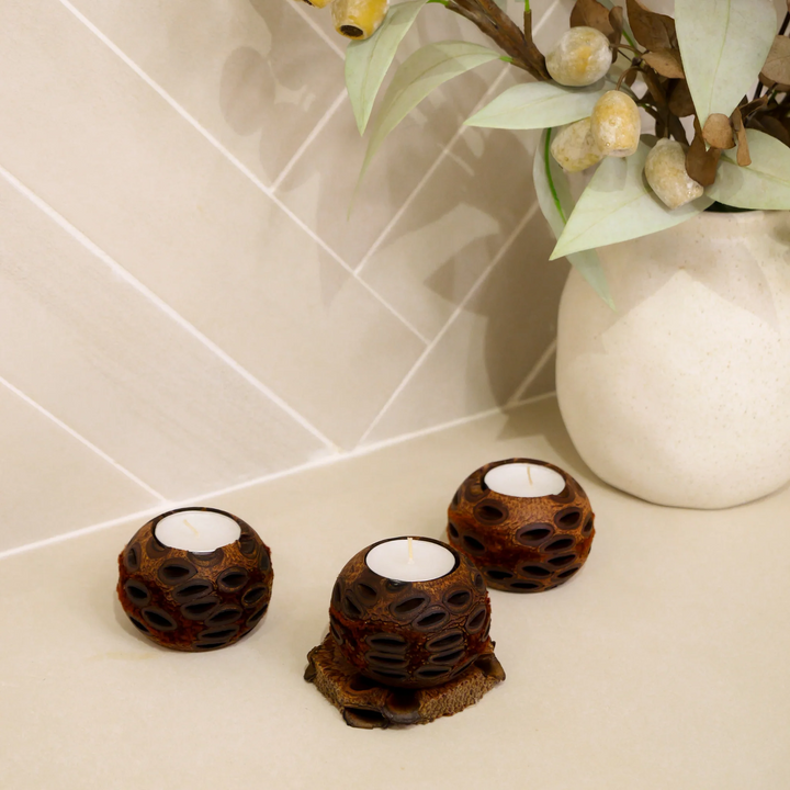 Each unique piece brings a touch of Australian wilderness to your home, perfect for creating cozy evenings or adding whimsy to dinner parties. The natural variations in each Banksia pod make your tealight holder a one-of-a-kind treasure that's as fun as it is functional. Watch as the dancing light creates fascinating shadow patterns through the natural openings!